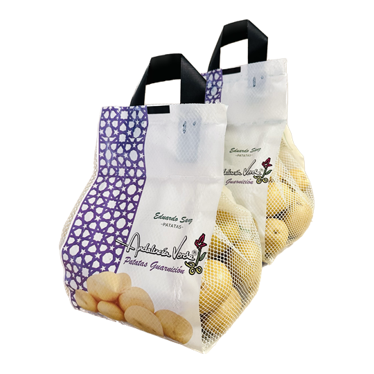 ENVASADO – En malla extrusionada de alta calidad con doble banda y asa. Estos productos van en conjuntos de 8 bolsas por saco de malla polymesh. Con marca Andalucía Verde o Granada Verde.