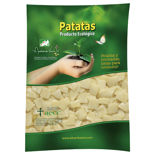Esta patata es ecológica. Se presenta pelada, cocinada al vapor y envasada al vacío, sin contener ningún tipo de alérgenos.