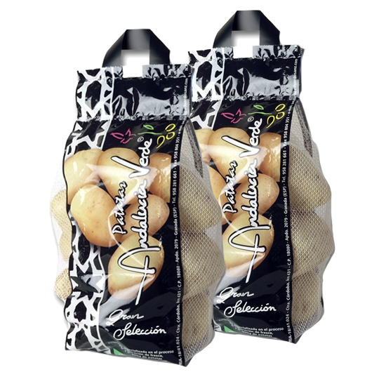 ENVASADO – En malla extrusionada de alta calidad con doble banda y asa. Estos productos van en conjuntos de 8 bolsas por saco de malla polymesh. Con marca Andalucía Verde o Granada Verde.